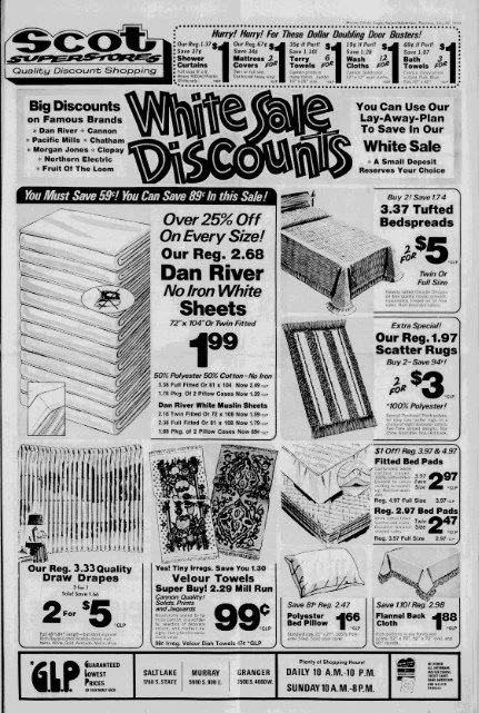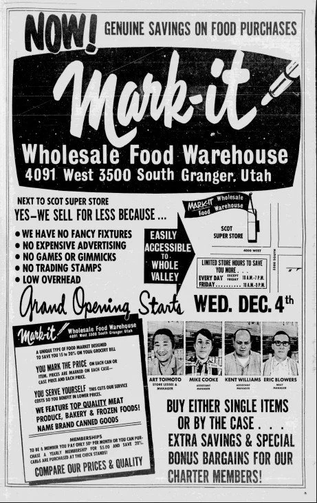 Next to the Scot Super Store in Granger, the Mark-It Wholesale Food Warehouse offered shoppers a unique way to save on groceries. Located at 4091 W. 3500 S., the store promised low prices by cutting overhead costs: no fancy fixtures, no expensive advertising, no games or gimmicks, and no trading stamps. Shoppers could see prices clearly marked on each item or case and served themselves, keeping service costs low and savings high. Mark-It featured top-quality meats, fresh produce, bakery items, frozen foods, and name-brand canned goods. Membership—just $0.50 per month or $5 per year—gave customers 15–20% savings and access to extra bonus bargains. Mark-It opened its doors with a grand opening on Wednesday, December 4, 1968, right next to the popular Scot Super Store