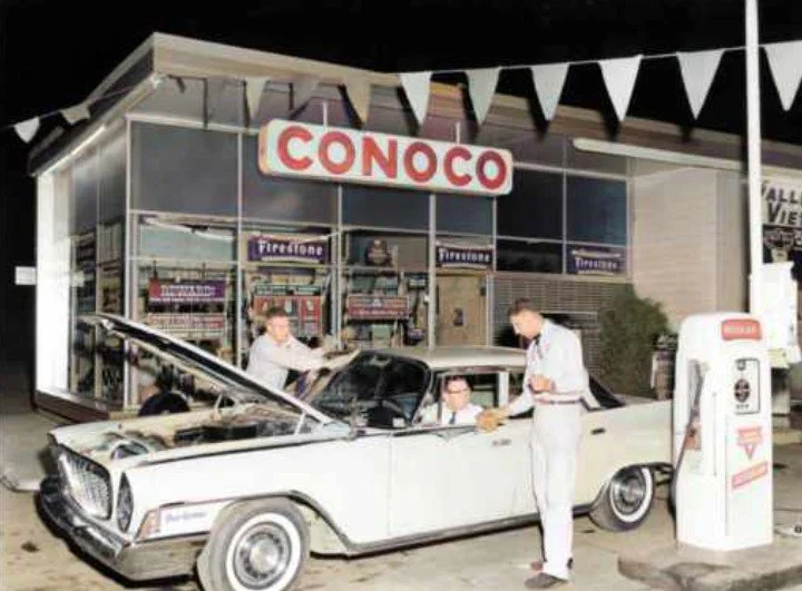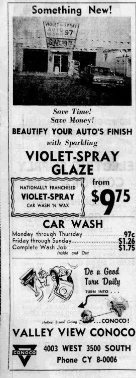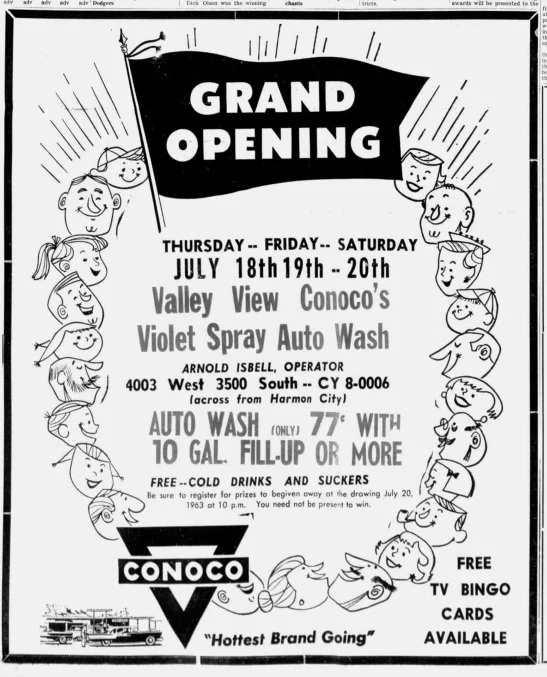 Arnold’s entrepreneurial spirit shone brightly in the postwar years. Among his several business ventures was the Violet Spray Auto Wash, located at 4003 West 3500 South, across the street from Harmon City. When it opened in the mid-1960s, the new “Valley View Conoco – Violet Spray Auto Wash” was advertised as “the finest auto wash in the county.” The grand opening celebration reflected Arnold’s cheerful and generous nature—offering free popcorn, balloons, pony rides, cold drinks, and prizes, including aluminum strainers for the first 50 customers. Families flocked to enjoy the festivities, complete with a live clown and KCPX-TV bingo cards, making the event a memorable community moment.