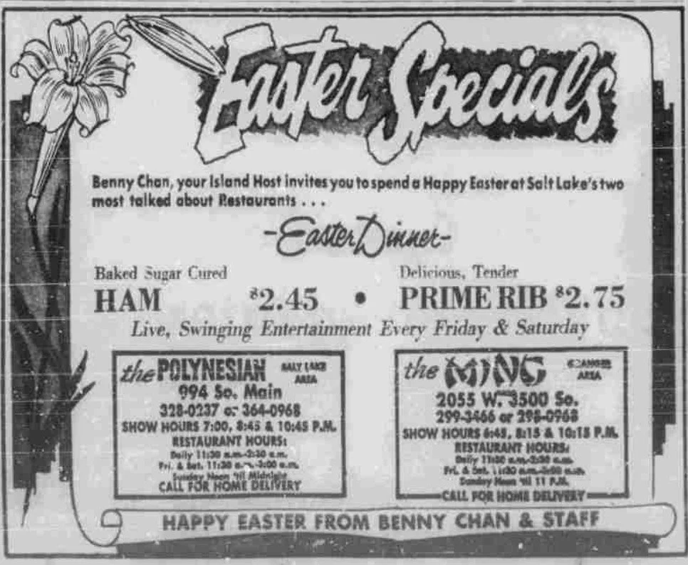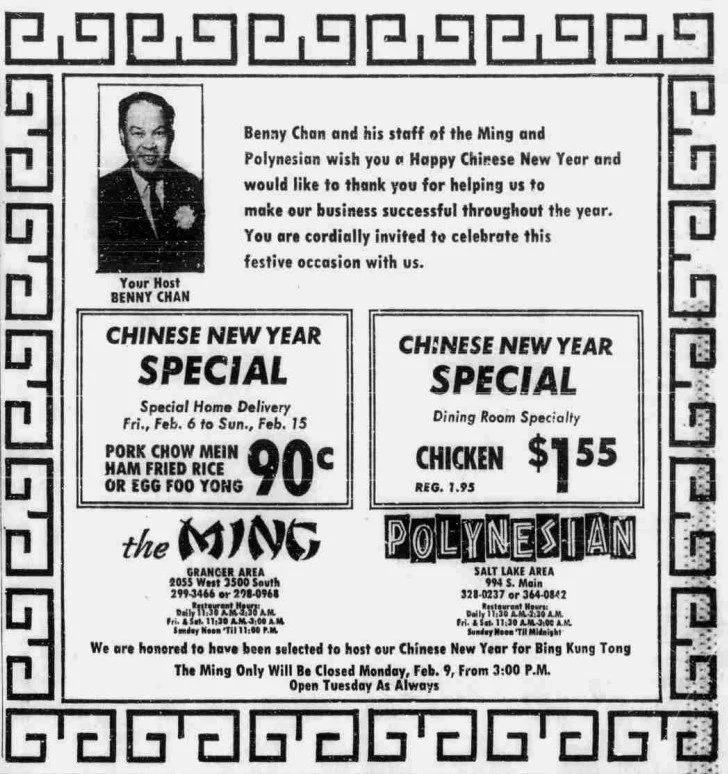 At The Ming, Cantonese cuisine was the star. Benny Chan combined his years of experience on the West Coast and his work at The Polynesian in downtown Salt Lake to craft a menu that appealed to both locals and adventurous diners. The restaurant offered everything from exotic beverages and Polynesian tidbits to a wide range of American and Cantonese dishes. Like his other ventures, The Ming provided home delivery, ensuring that the flavors of Cantonese cuisine were accessible across the area.