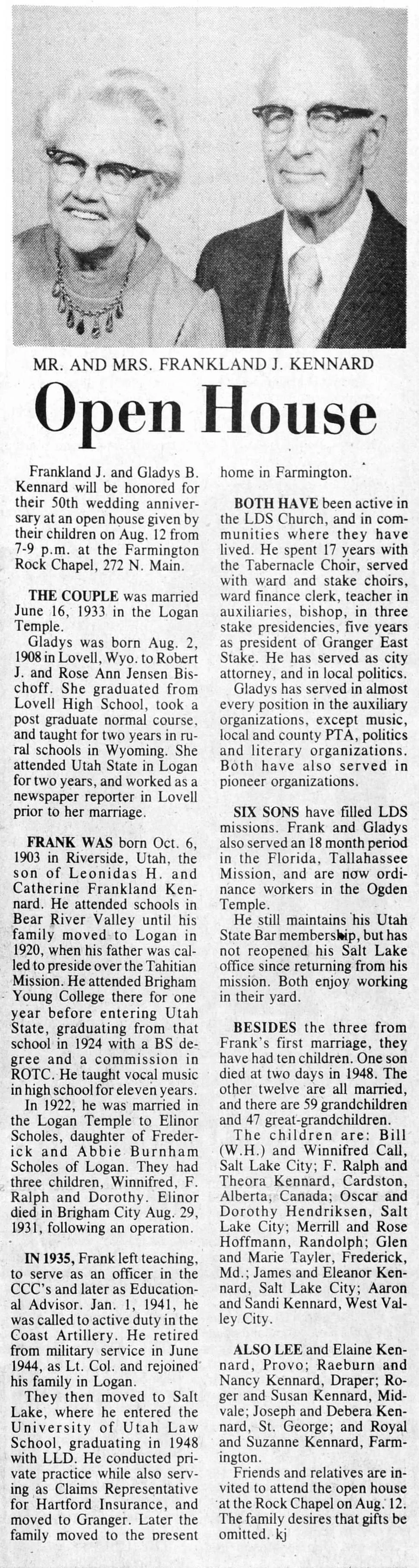 The Kennard Family lived at 2470 W 3500 South It was a sad day when the Kennard family moved to Davis County.