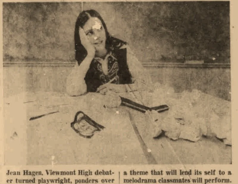 Jean played Ophelia herself, joined by Rick Barlow as the hero and Rick Huish as the villain. Fellow student Gary Green composed original lyrics, and the production was sponsored by the National Honor Society. Jean also wrote a hijacker-themed debate play for a school event the same year, showcasing her early flair for writing that was witty, relevant, and entertaining.